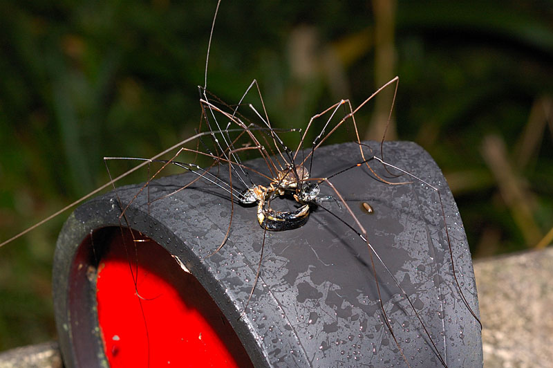 三隻盲蛛在吃ㄧ節應該是蟬的殘骸...